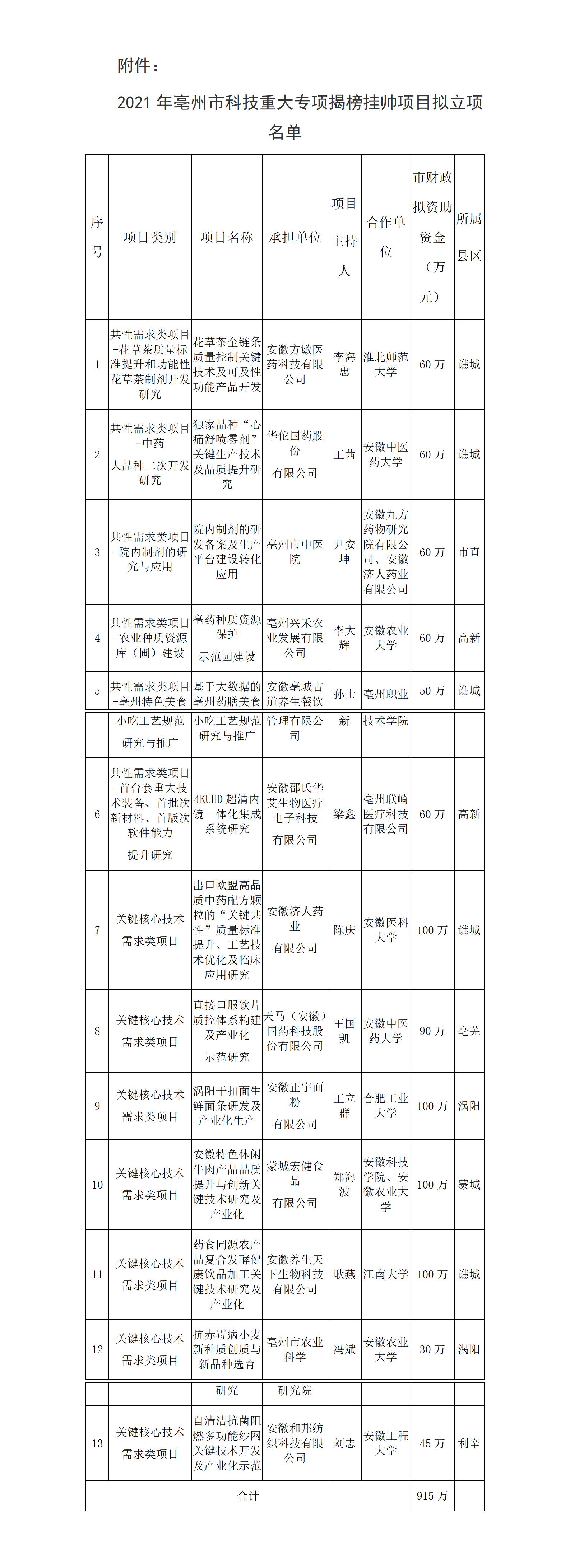 根據(jù)《關(guān)于發(fā)布2021年市科技重大專項揭榜掛帥項目張榜清單(申報指南)的通知》(亳科〔2021〕50號),經(jīng)組織申報、專家評審、會議研究等程序,2021年亳州市科技重大專項揭榜掛帥項目擬立項13項(詳見附件),其中共性需求類項目6項,關(guān)鍵核心技術(shù)需求類項目7項,現(xiàn)予以公示。